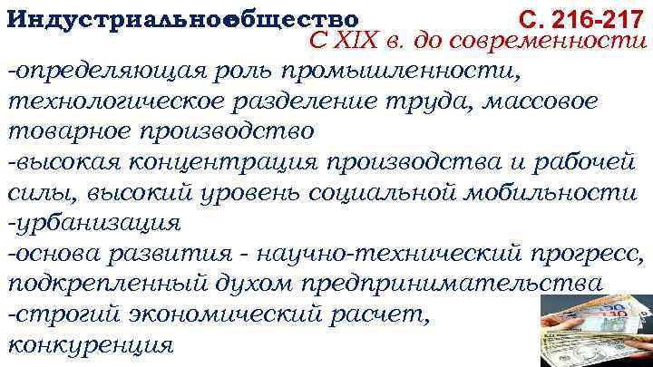 Индустриальное общество С. 216 -217 С XIX в. до современности -определяющая роль промышленности, технологическое разделение труда, массовое товарное производство -высокая концентрация производства и рабочей силы, высокий уровень социальной мобильности -урбанизация -основа развития - научно-технический прогресс, подкрепленный духом предпринимательства -строгий экономический расчет, конкуренция