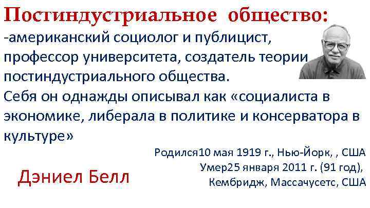 Постиндустриальное общество: -американский социолог и публицист, профессор университета, создатель теории постиндустриального общества. Себя он однажды описывал как «социалиста в экономике, либерала в политике и консерватора в культуре» Дэниел Белл Родился 10 мая 1919 г. , Нью-Йорк, , США Умер25 января 2011 г. (91 год), Кембридж, Массачусетс, США