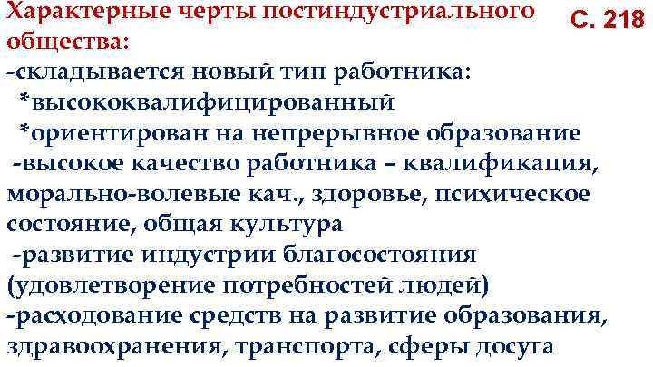 Характерные черты постиндустриального С. 218 общества: -складывается новый тип работника: *высококвалифицированный *ориентирован на непрерывное образование -высокое качество работника – квалификация, морально-волевые кач. , здоровье, психическое состояние, общая культура -развитие индустрии благосостояния (удовлетворение потребностей людей) -расходование средств на развитие образования, здравоохранения, транспорта, сферы досуга