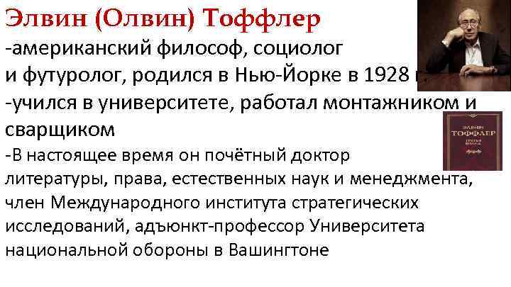 Элвин (Олвин) Тоффлер -американский философ, социолог и футуролог, родился в Нью-Йорке в 1928 г. -учился в университете, работал монтажником и сварщиком -В настоящее время он почётный доктор литературы, права, естественных наук и менеджмента, член Международного института стратегических исследований, адъюнкт-профессор Университета национальной обороны в Вашингтоне