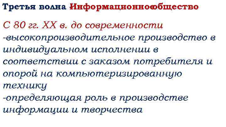 Третья волна Информационное общество С 80 гг. XX в. до современности -высокопроизводительное производство в индивидуальном исполнении в соответствии с заказом потребителя и опорой на компьютеризированную технику -определяющая роль в производстве информации и творчества