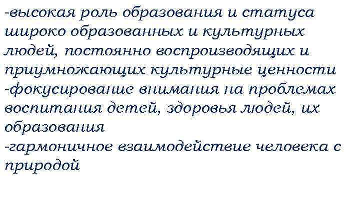 -высокая роль образования и статуса широко образованных и культурных людей, постоянно воспроизводящих и приумножающих культурные ценности -фокусирование внимания на проблемах воспитания детей, здоровья людей, их образования -гармоничное взаимодействие человека с природой