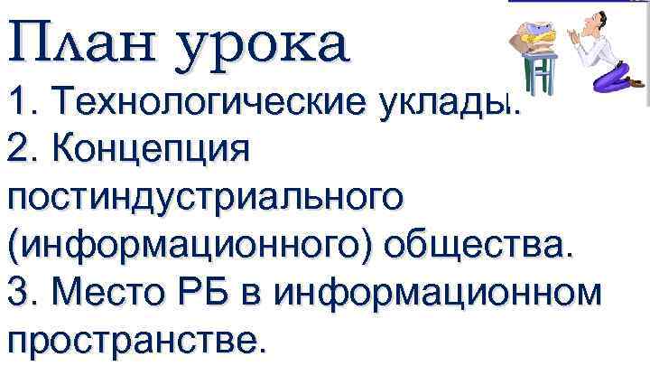 План урока 1. Технологические уклады. 2. Концепция постиндустриального (информационного) общества. 3. Место РБ в информационном пространстве.