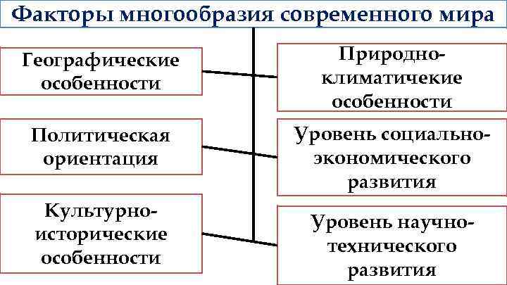 Факторы многообразия современного мира Географические особенности Природноклиматичекие особенности Политическая ориентация Уровень социальноэкономического развития Культурноисторические особенности Уровень научнотехнического развития