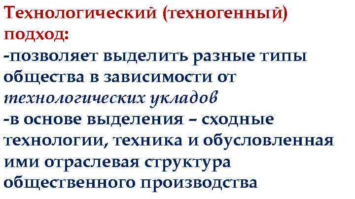 Технологический (техногенный) подход: -позволяет выделить разные типы общества в зависимости от технологических укладов -в основе выделения – сходные технологии, техника и обусловленная ими отраслевая структура общественного производства