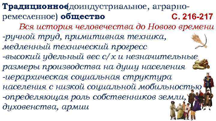 Традиционное (доиндустриальное, аграрноремесленное) общество С. 216 -217 Вся история человечества до Нового времени -ручной труд, примитивная техника, медленный технический прогресс -высокий удельный вес с/х и незначительные размеры производства на душу населения -иерархическая социальная структура населения с низкой социальной мобильностью -определяющая роль собственников земли, духовенства, армии