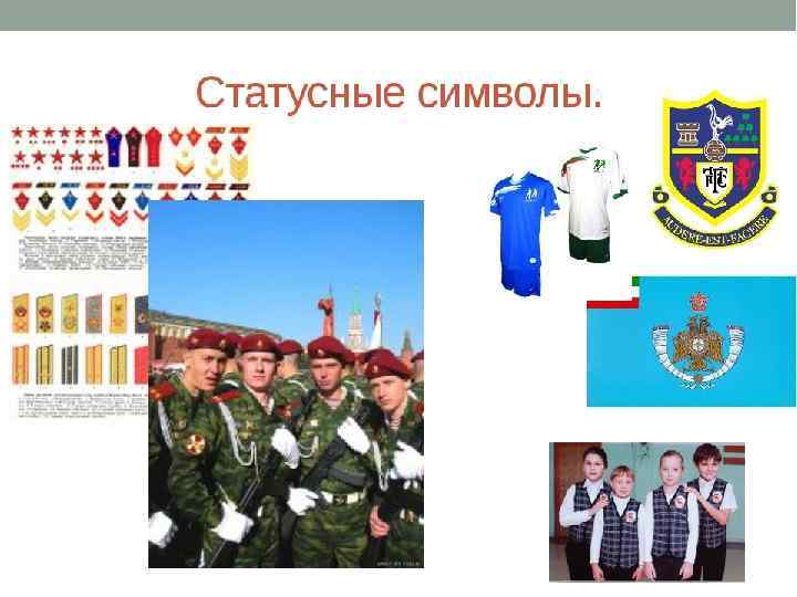 КОМПОНЕНТЫ СОЦИАЛЬНОГО СТАТУСА • СТАТУСНЫЕ ПРАВА И ОБЯЗАННОСТИ (права и обязанности); • СТАТУСНЫЙ ДИАПАЗОН (установленные рамки осуществления прав и обязанностей); • СТАТУСНЫЕ СИМВОЛЫ (внешние знаки отличия)% • СТАТУСНЫ ОБРАЗ (ИМИДЖ) (представления о том, как должен выглядеть и вести себя индивид в соответствии со своим статусом); • СТАТУСНАЯ ИДЕНТИФИКАЦИЯ (определение степени индивида ствоему статусу)
