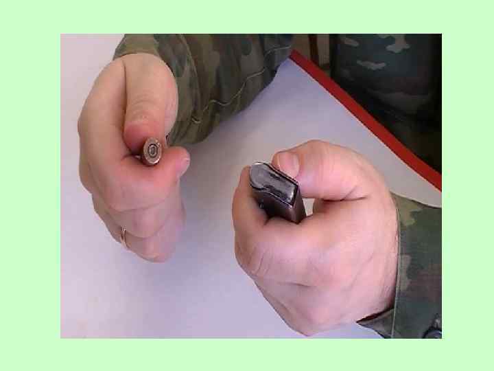 По команде «Оружие - к осмотру» стреляющий обязан: - левой рукой вынуть магазин из основания рукоятки пистолета и вложить его под большой палец правой руки впереди предохранителя (рис. ) так, чтобы подаватель магазина был на 2 3 см. выше затвора; - после осмотра оружия руководителем стрельбы взять магазин в левую руку; - большим пальцем правой руки нажать на кнопку затворной задержки и освободить затвор; - нажав на спусковой крючок, произвести контрольный спуск курка; - поставить предохранитель в положение «предохранение» ; - вставить магазин в основание рукоятки; - вложить пистолет в кобуру и застегнуть крышку кобуры.