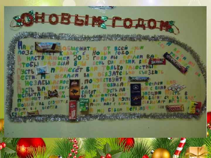 Как без ёлок в поздравлении, Надо добавить настроения! Вновь по сусекам поскребли, Бумажных салфеток наскребли! И вновь закипела студентов работа, Ни спать и ни есть нам неохота! Фантазии наши невозможно унять, Имена мы ёлкам стали давать.