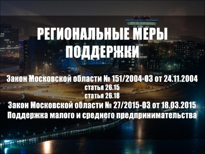 Закон Московской области № 27/2015 -ОЗ от 18. 03. 2015 УСЛОВИЯ ДОКУМЕНТЫ ØРегистрация в Московской области ØБизнес-план и финансовая модель ØСоответствие приоритетам и целям стратегии социальноэкономического развития МО, государственных программ МО ØУчредительные документы организации-инициатора проекта ØУвеличение количества рабочих мест ØУвеличение ежегодных налоговых поступлений ØДокументы, подтверждающие положительную финансовоэкономическую деятельность инициатора