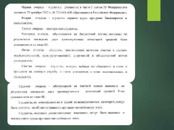 Общие положения размещаются: - иногородние студенты очной формы обучения аспиранты заочной формы обучения на период экзаменов имеют право заселиться*: - стажеры и слушатели подготовительных курсов ЛГТУ - студентов, постоянно проживающих на территории г. Липецка Действует на основании: - жилищного законодательства РФ - Устава ЛГТУ - Локальных актов ЛГТУ * при условии полной обеспеченности местами и по согласованию с профсоюзной организации