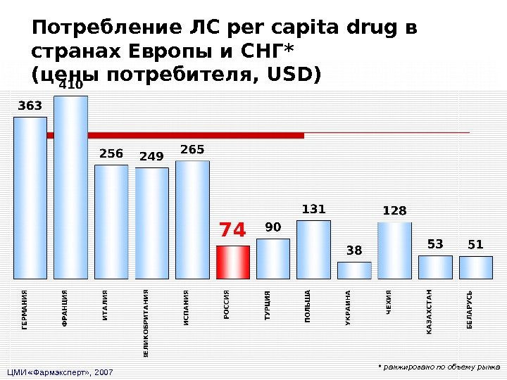 Потребление ЛС per capita drug в странах Европы и СНГ * (цены потребителя, USD ) * ранжировано по объему рынка ЦМИ «Фармэксперт» ,