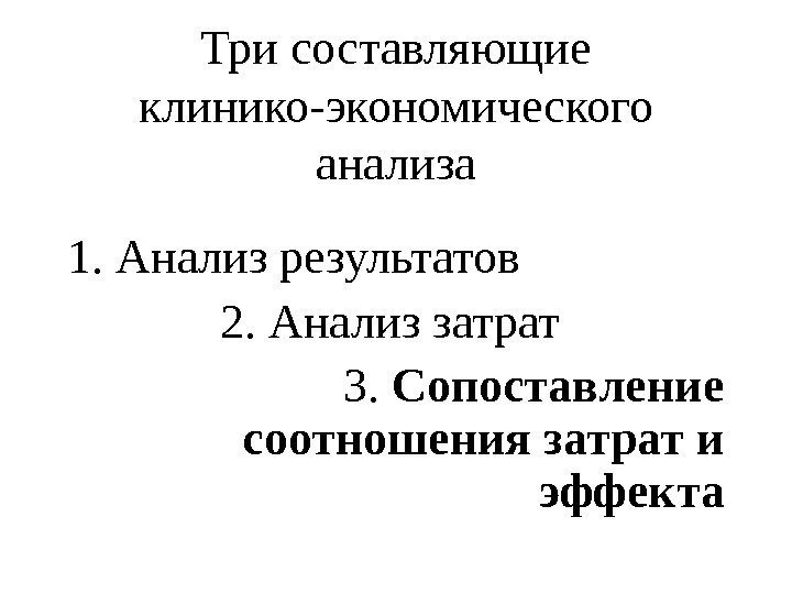 Три составляющие клинико-экономического анализа 1. Анализ результатов 2. Анализ затрат 3. Сопоставление соотношения затрат и эффекта
