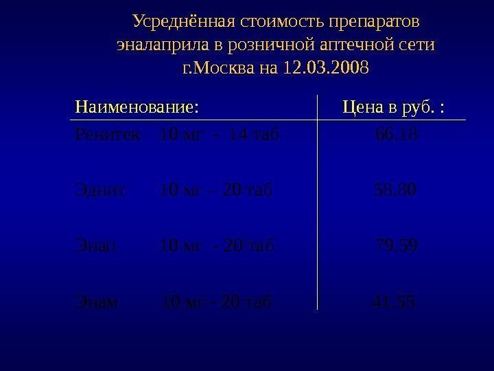 Усреднённая стоимость препаратов эналаприла в розничной аптечной сети г. Москва на 12. 03. 2008 Наименование: Цена в руб. : Ренитек 10 мг — 14 таб 66. 18 Эднит 10 мг – 20 таб 58. 80 Энап 10 мг — 20 таб 79. 59 Энам 10 мг — 20 таб 41.