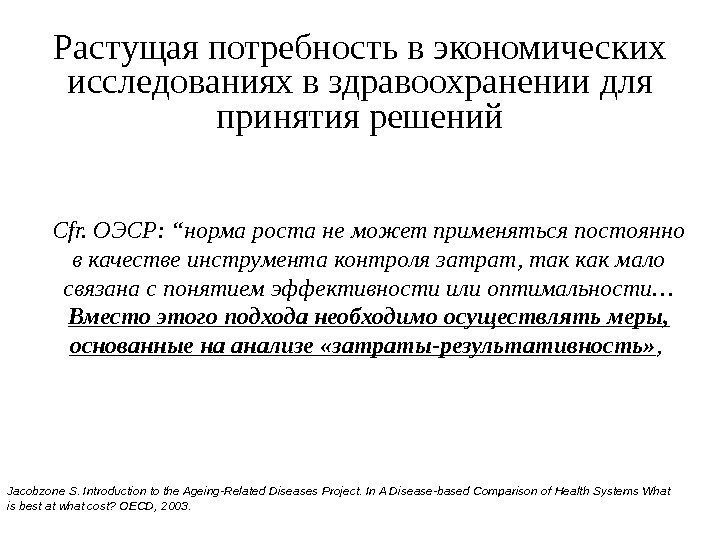 Растущая потребность в экономических исследованиях в здравоохранении для принятия решений Cfr. ОЭСР : “ норма роста не может применяться постоянно в качестве инструмента контроля затрат, так как мало связана с понятием эффективности или оптимальности… Вместо этого подхода необходимо осуществлять меры, основанные на анализе «затраты-результативность» , Jacobzone S. Introduction to the Ageing-Related Diseases Project. In A Disease-based Comparison of Health Systems What is best at what cost? OECD, 2003.