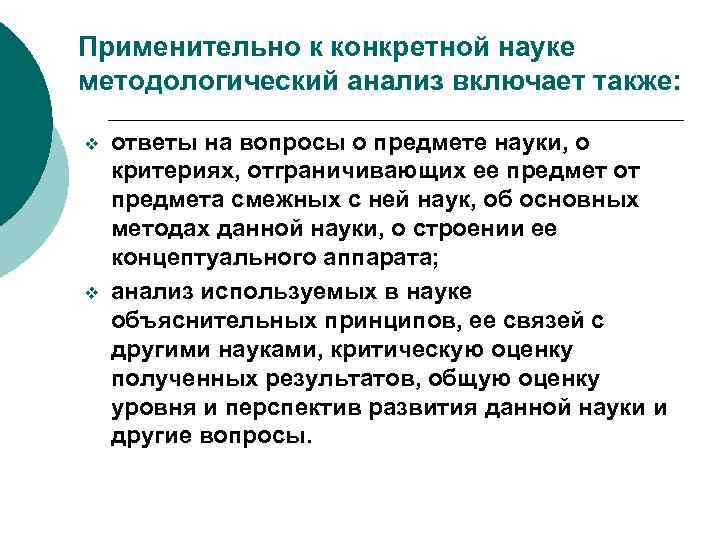 Применительно к конкретной науке методологический анализ включает также: v v ответы на вопросы о предмете науки, о критериях, отграничивающих ее предмет от предмета смежных с ней наук, об основных методах данной науки, о строении ее концептуального аппарата; анализ используемых в науке объяснительных принципов, ее связей с другими науками, критическую оценку полученных результатов, общую оценку уровня и перспектив развития данной науки и другие вопросы.
