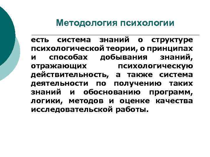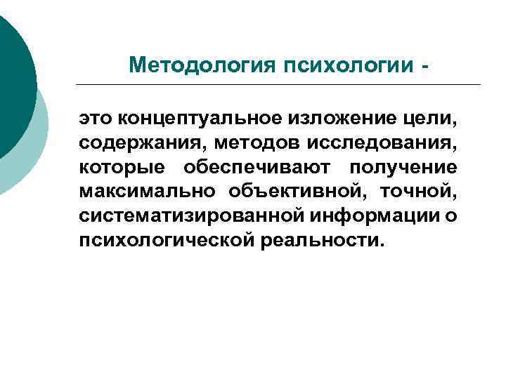 Методология психологии это концептуальное изложение цели, содержания, методов исследования, которые обеспечивают получение максимально объективной, точной, систематизированной информации о психологической реальности.