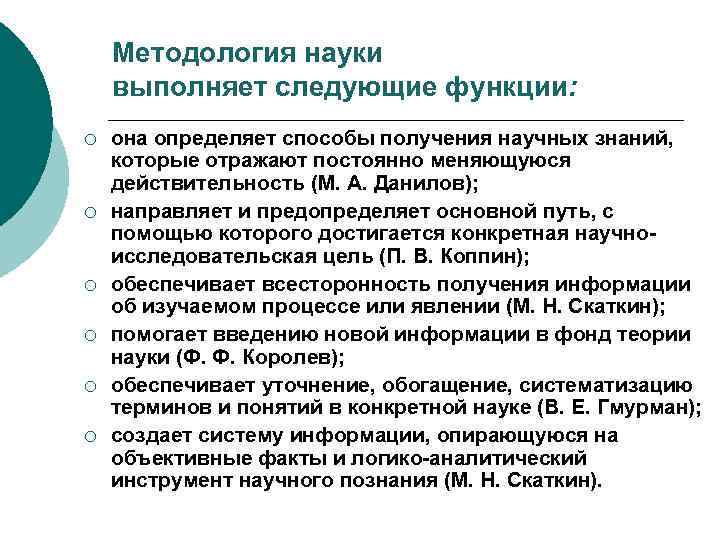 Методология науки выполняет следующие функции: ¡ ¡ ¡ она определяет способы получения научных знаний, которые отражают постоянно меняющуюся действительность (М. А. Данилов); направляет и предопределяет основной путь, с помощью которого достигается конкретная научноисследовательская цель (П. В. Коппин); обеспечивает всесторонность получения информации об изучаемом процессе или явлении (М. Н. Скаткин); помогает введению новой информации в фонд теории науки (Ф. Ф. Королев); обеспечивает уточнение, обогащение, систематизацию терминов и понятий в конкретной науке (В. Е. Гмурман); создает систему информации, опирающуюся на объективные факты и логико-аналитический инструмент научного познания (М. Н. Скаткин).