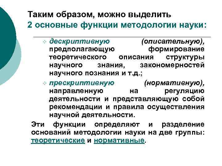 Таким образом, можно выделить 2 основные функции методологии науки: дескриптивную (описательную), предполагающую формирование теоретического описания структуры научного знания, закономерностей научного познания и т. д. ; v прескриптивную (нормативную), направленную на регуляцию деятельности и представляющую собой рекомендации и правила осуществления научной деятельности. Эти функции определяют и разделение оснований методологии науки на две группы: теоретические и нормативные. v