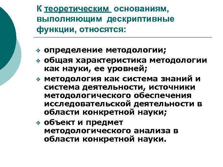 К теоретическим основаниям, выполняющим дескриптивные функции, относятся: v v определение методологии; общая характеристика методологии как науки, ее уровней; методология как система знаний и система деятельности, источники методологического обеспечения исследовательской деятельности в области конкретной науки; объект и предмет методологического анализа в области конкретной науки.