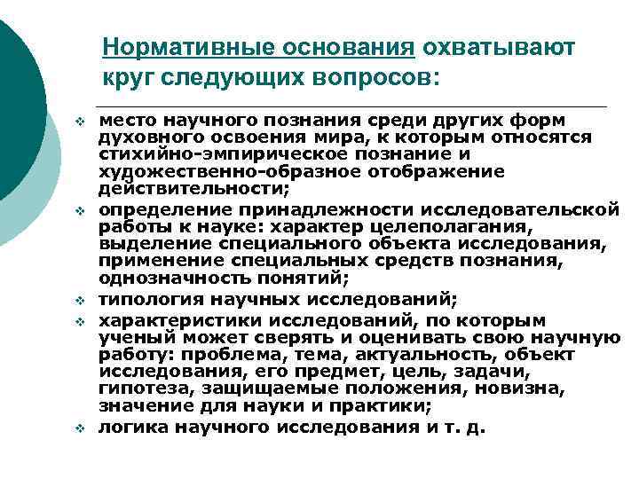 Нормативные основания охватывают круг следующих вопросов: v v v место научного познания среди других форм духовного освоения мира, к которым относятся стихийно-эмпирическое познание и художественно-образное отображение действительности; определение принадлежности исследовательской работы к науке: характер целеполагания, выделение специального объекта исследования, применение специальных средств познания, однозначность понятий; типология научных исследований; характеристики исследований, по которым ученый может сверять и оценивать свою научную работу: проблема, тема, актуальность, объект исследования, его предмет, цель, задачи, гипотеза, защищаемые положения, новизна, значение для науки и практики; логика научного исследования и т. д.
