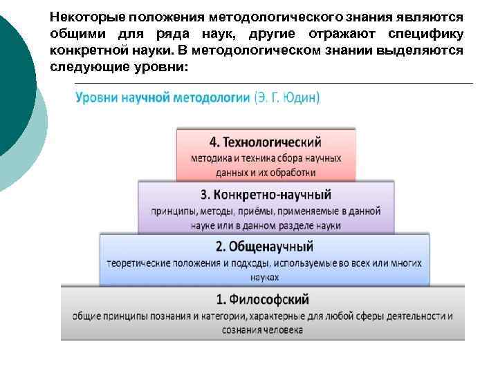 Некоторые положения методологического знания являются общими для ряда наук, другие отражают специфику конкретной науки. В методологическом знании выделяются следующие уровни:
