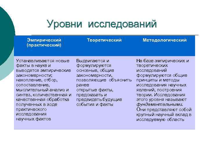 Уровни исследований Эмпирический (практический) Теоретический Методологический Устанавливаются новые факты в науке и выводятся эмпирические закономерности; накопление, отбор, сопоставление, мыслительный анализ и синтез, количественная и качественная обработка полученных в ходе практического исследования научных фактов Выдвигаются и формулируются основные, общие закономерности, позволяющие объяснить ранее открытые факты, предсказать и предвидеть будущие события и факты На базе эмпирических и теоретических исследований формулируются общие принципы и методы исследования научных явлений, построения теории. Исследования этого уровня называют фундаментальными. Они представляют собой крупный научный вклад в исследуемую область