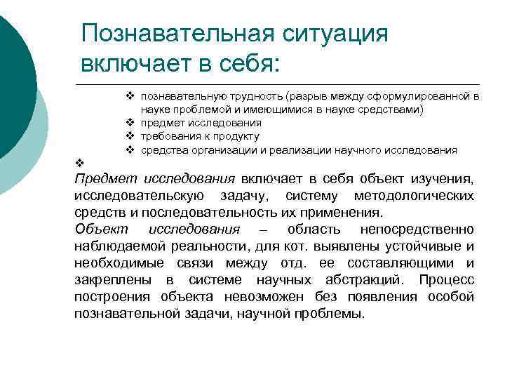Познавательная ситуация включает в себя: v познавательную трудность (разрыв между сформулированной в науке проблемой и имеющимися в науке средствами) v предмет исследования v требования к продукту v средства организации и реализации научного исследования v Предмет исследования включает в себя объект изучения, исследовательскую задачу, систему методологических средств и последовательность их применения. Объект исследования – область непосредственно наблюдаемой реальности, для кот. выявлены устойчивые и необходимые связи между отд. ее составляющими и закреплены в системе научных абстракций. Процесс построения объекта невозможен без появления особой познавательной задачи, научной проблемы.