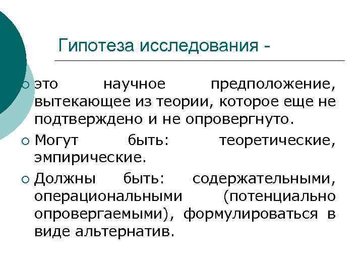 Гипотеза исследования это научное предположение, вытекающее из теории, которое еще не подтверждено и не опровергнуто. ¡ Могут быть: теоретические, эмпирические. ¡ Должны быть: содержательными, операциональными (потенциально опровергаемыми), формулироваться в виде альтернатив. ¡