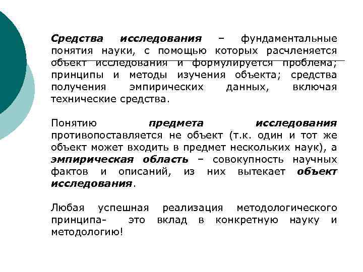 Средства исследования – фундаментальные понятия науки, с помощью которых расчленяется объект исследования и формулируется проблема; принципы и методы изучения объекта; средства получения эмпирических данных, включая технические средства. Понятию предмета исследования противопоставляется не объект (т. к. один и тот же объект может входить в предмет нескольких наук), а эмпирическая область – совокупность научных фактов и описаний, из них вытекает объект исследования. Любая успешная реализация методологического принципа- это вклад в конкретную науку и методологию!