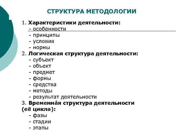 СТРУКТУРА МЕТОДОЛОГИИ СТРУКТУРА 1. Характеристики деятельности: - особенности - принципы - условия - нормы 2. Логическая структура деятельности: - субъект - объект - предмет - формы - средства - методы - результат деятельности 3. Временнáя структура деятельности (её цикла): - фазы - стадии - этапы