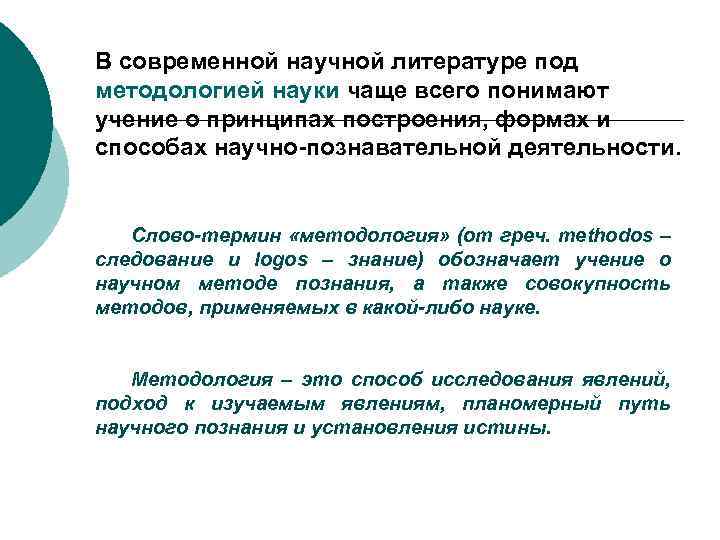 В современной научной литературе под методологией науки чаще всего понимают учение о принципах построения, формах и способах научно-познавательной деятельности. Слово-термин «методология» (от греч. methodos – следование и logos – знание) обозначает учение о научном методе познания, а также совокупность методов, применяемых в какой-либо науке. Методология – это способ исследования явлений, подход к изучаемым явлениям, планомерный путь научного познания и установления истины.