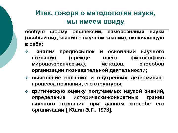 Итак, говоря о методологии науки, мы имеем ввиду особую форму рефлексии, самосознания науки (особый вид знания о научном знании), включающую в себя: v анализ предпосылок и оснований научного познания (прежде всего философскомировоззренческих), методов, способов организации познавательной деятельности; v выявление внешних и внутренних детерминант процесса познания, его структуры; v критическую оценку получаемых наукой знаний, определение исторически-конкретных границ научного познания при данном способе его организации [ Юдин Э. Г. , 1978].