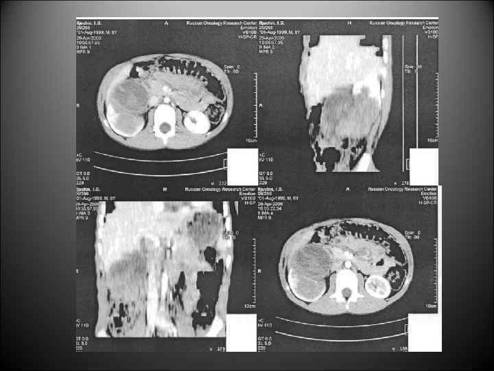 Диагностика нефробластомы • УЗИ брюшной полости с использованием допплерографии определение топики локализации опухолевого процесса, взаимоотношение с прилежащими органами и тканями, магистральными сосудами • РКТ брюшной полости - детализация патологического процесса, оценка распространености • Прицельная биопсия под контролем УЗИ или РКТ • Абдоминальная ангиография - уточнение объема поражения органа, что особенно важно для планирования органосохранных операций • МРТ - используется при диагностически сложных случаях • РКТ или рентгенологическое исследование грудной клетки в 4 стандартных проекциях • Радионуклеидное исследование почек, забрюшинных лимфатических узлов