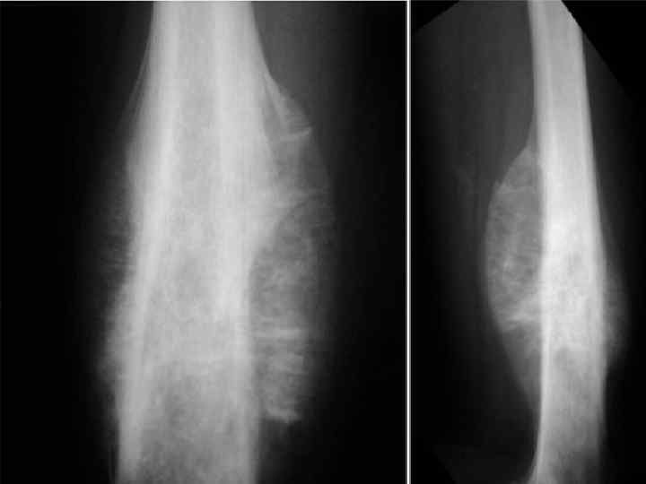 Остеогенная саркома Новообразование развивается чаще в длинных трубчатых костях. Опухоль склонна к раннему гематогенному метастазированию. В настоящее время в ряде случаев оперативное вмешательство возможно в виде органосохранной операции с эндопротезированием. Современные методы позволяют излечить 50 -60% больных детей при операбельных стадиях