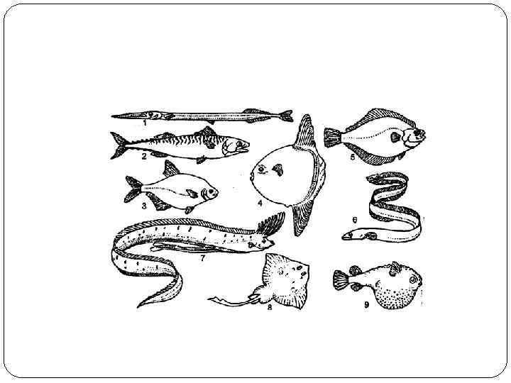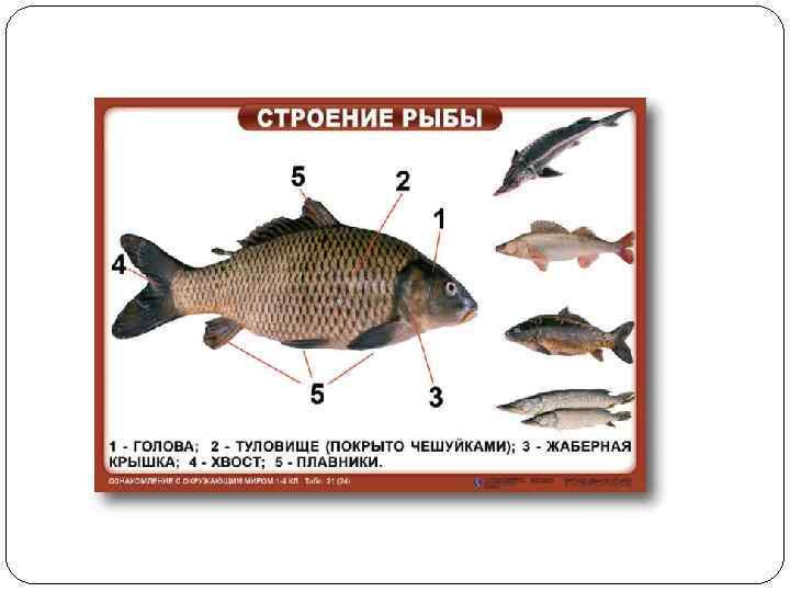 Общие признаки: Водные позвоночные Форма тела обтекаемая Покровительственная окраска Имеют хрящевой или костный скелет Головной и спинной мозг Органы дыхания жабры Жаберные крышки Тело покрыто чешуёй и слизью Отделы тела: голова, туловище, хвост