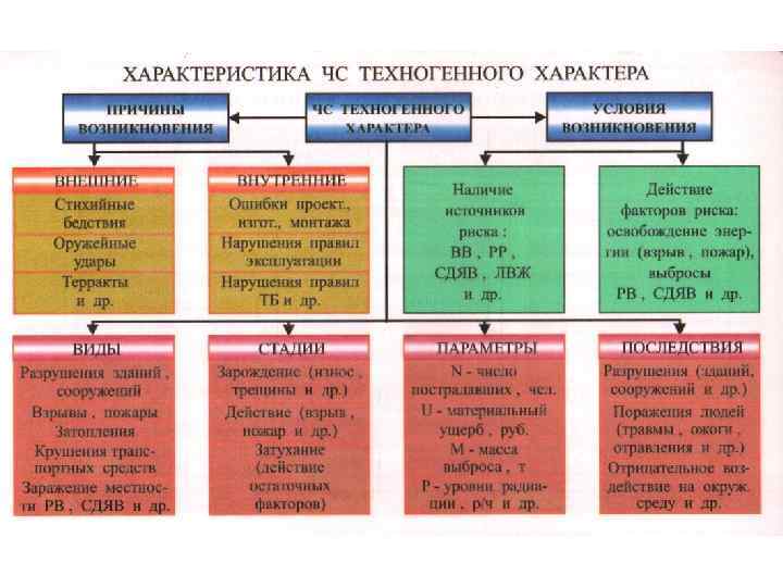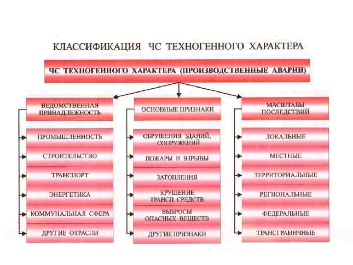По причинам возникновения аварий: неудачные проектные решения, отступление от проектной документации; недооценка действующей нагрузки; потеря устойчивости; некачественное изготовление, монтаж конструкции; нарушение правил эксплуатации; аварии в результате усталости, вибраций, коррозии; непредвиденные стихийные бедствия. По степени внезапности: внезапные (взрывы, транспортные аварии); быстро распространяющиеся (пожары, гидродинамические аварии с образованием волн прорыва); умеренно распространяющиеся (аварии на коммунальных системах); медленно распространяющиеся (аварии на очистных сооружениях, экологические отклонения). По отраслям народного хозяйства, где могут возникнуть ЧС: на транспорте; в промышленности и энергетике; в строительстве; в коммунально-жилищной сфере. По долговременности и обратимости последствий: кратковременного воздействия (загрязнение участка местности аварийно химически опасными веществами (АХОВ); затопление и т. п. ); долговременного воздействия (загрязнение местности радиоактивными веществами)