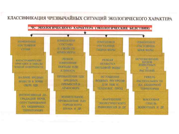 Катастрофа – крупная авария, повлекшая за собой человеческие жертвы, значительный материальный ущерб и другие тяжелые последствия. Опасное природное явление – стихийное событие природного происхождения, которое по своей интенсивности, масштабу распространения и продолжительности может вызвать отрицательные последствия для жизнедеятельности людей, экономики и природной среды. Стихийное бедствие – катастрофическое природное явление (или процесс), которое может вызвать многочисленные человеческие жертвы, значительный материальный ущерб и другие тяжелые последствия. Экологическое бедствие (экологическая катастрофа) – чрезвычайное событие особо крупных масштабов, вызванное изменением (под воздействием антропогенных факторов) состояния суши, атмосферы, гидросферы и биосферы и отрицательно повлиявшее на здоровье людей, их духовную сферу, среду обитания, экономику или генофонд. Экологические бедствия часто сопровождаются необратимыми изменениями природной среды.