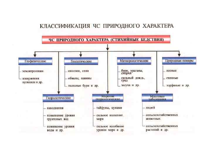 Классификация ЧС • По причинам возникновения: техногенного, природного экологического характера; • По масштабу распространения: локальные, местные, территориальные, региональные, федеральные и трансграничные; • По характеру поражающих факторов или источников опасности: тепловые, химические, радиоактивные, воздействие ударной волны или урагана, гидрологические, биологические; • По характеру воздействия на основные объекты поражения: разрушение, заражение, затопление, пожары.
