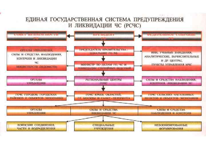 Основные задачи РСЧС • проведение единой государственной политики в области предупреждения и ликвидации чрезвычайных ситуаций, • сформировать и внедрить четкую систему экономических и правовых мер, направленных на обеспечение защиты населения, технической и экологической безопасности. • проведение мероприятий по защите населения и территории. • организация оповещения и информирование населения о чрезвычайных ситуациях. • ликвидация чрезвычайных ситуаций. • оказание гуманитарной помощи. • подготовка руководящего состава, специалистов и обучение населения. • обеспечение функционирования объектов и отраслей в чрезвычайных ситуациях. • организация пропаганды среди граждан России социальноэкономической значимости, места и роли РСЧС в общей системе безопасности страны.