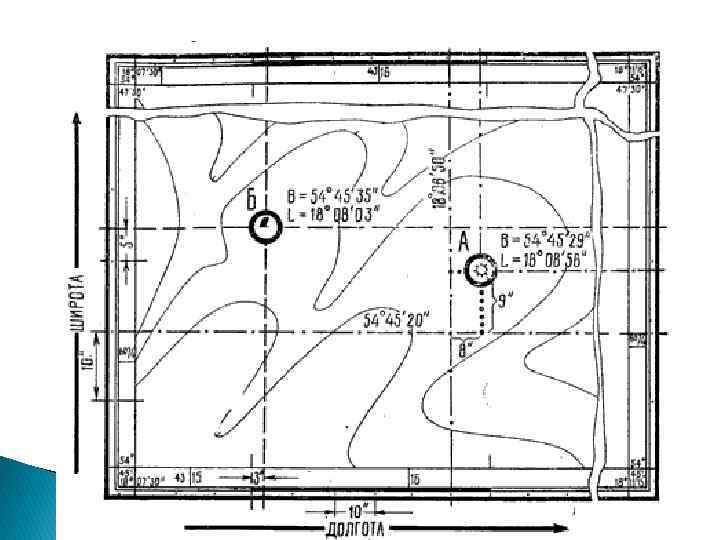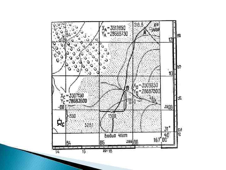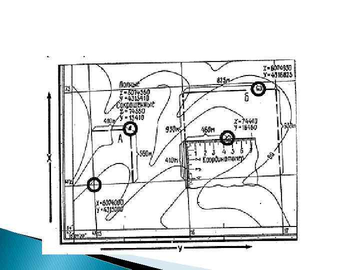 Прямоугольные координаты в системе Гаусса-Крюгера Координаты точки М – 8 Х=5918560. 00 м У =8832126. 00 м точки L - Х = 3942566. 00 м У = 8256410. 00 м Координата Х – точка М находится на удалении 5918 км 560 м от экватора. Координата У – точка М находится в 8 координатной зоне на удалении от условно вынесенного меридиана восточнее 332 км 126 метров.
