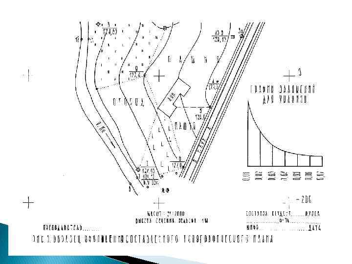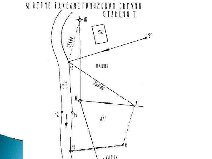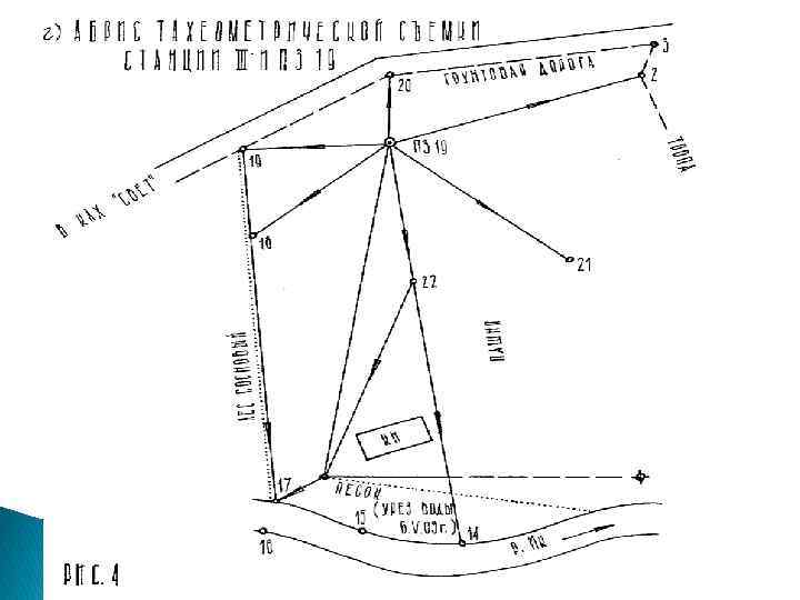 Выписка из тахеометрического журнала Номера точек наблюдения Отсчеты по горизонтальному кругу ˚ 1 ‘ 2 Горизонталь ные Превышения проложения 3 4 Станция ПЗ 8 I 1 2 3 3 а 4 0 57 140 181 238 345 00 50 05 10 00 00 111, 2 61, 8 66, 0 13, 6 82, 1 -4, 17 -2, 32 +0, 20 +0, 05 Отметки Примечания станций реечных точек 5 6 7 _____ т. 3 – на грунтовой дороге Станция I II ПЗ 8 5 6 7 8 9 0 13 52 148 175 327 00 00 05 30 58 45 149, 6 68, 0 11, 8 25, 2 147, 8 -0, 30 +4, 13 +4, 05 +2, 02 -0, 80 +2, 06 т. 7, 8 – на линии уреза воды