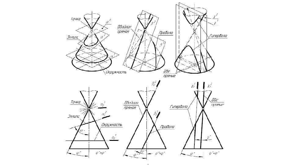 ПОЗИЦИОННЫЕ ЗАДАЧИ НА ПОВЕРХНОСТИ 1. Пересечение поверхности плоскостью 2. Конические сечения 3. Взаимные пересечения поверхностей В результате пересечения плоскости с кривыми поверхностями получаются плоские кривые линии. Рассмотрим эту тему на примере пересечения плоскости с поверхностями вращения: цилиндрической, конической и сферической, которые являются поверхностями второго порядка. Следовательно, в пересечении их с плоскостью получаются кривые второго порядка – эллипс, гипербола и парабола. И как частный случай – точка, прямая и окружность [2].