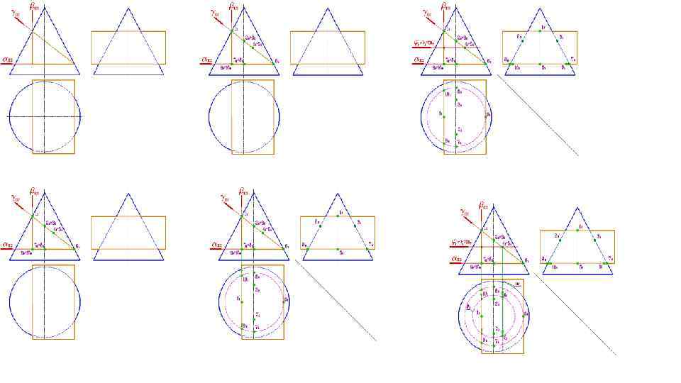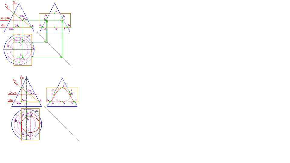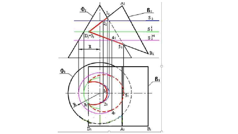 Метод секущих плоскостей 1) Ввести вспомогательные секущие плоскости (поверхности) так, чтобы они пересекали две поверхности Г⋂Σ, Г⋂Ω 2)Построить линии пересечения заданных поверхностей с вспомогательными плоскостями m= Г⋂Σ, n= Г⋂Ω 3) Определить точки пересечения построенных линий пересечения M, N=m⋂n M, N= Σ⋂Ω При решении задач на пересечение поверхностей сначала построить опорные точки ( точки на ребрах) Экстремальные – наивысшая, наинизшая Точки видимости