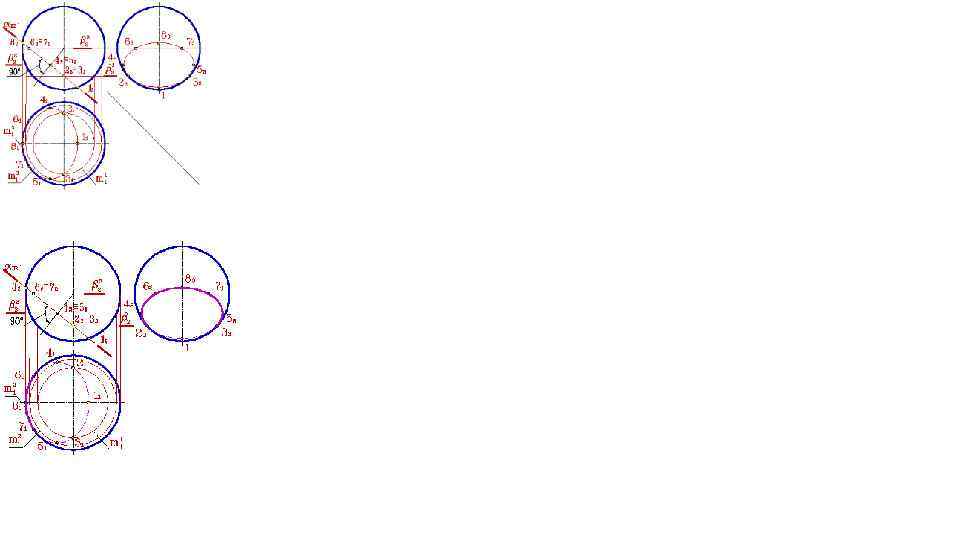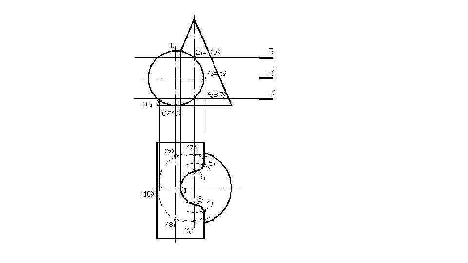 точки 1 и 6 – пересечения плоскости γ с очерком проекции конуса на плоскость П 2 (главным меридианом), эти точки определяют положение большой оси эллипса, кроме того точка 12 –проекция точки вершины гиперболы и одновременно принадлежит конусу (лежит на очерке фронтальной проекции конуса) и ребру призмы (линии пересечения плоскостей α и β), а точка 62 - проекция точки, одновременно принадлежащей конусу и ребру призмы (линии пересечения плоскостей α и γ); точки 2, 3, 7 и 8 – характерны тем, что их профильные проекции лежат на очерке проекции конуса; 4, 5 - точки, лежащие на середине отрезка [1, 6] (большой оси эллипса) и определяют положение малой оси эллипса; точки 9, 10 – одновременно принадлежащие конусу и ребру призмы (образованному пересечением плоскостей α и β). Рассмотрим последовательность нахождения проекций точек 4 и 5. Через фронтальные проекции этих точек проведем вспомогательную секущую плоскость φ. Эта плоскость пересекает конус по параллели p, а грань призмы по прямой линии m, параллельной ребру. На горизонтальной плоскости проекций пересечение p 1 и m 1 определяют положение точек 41 и 51. Для точного построения кривых линий пересечения поверхностей обозначенных точек не достаточно. После нахождения проекций всех точек их необходимо соединить с учетом видимости
