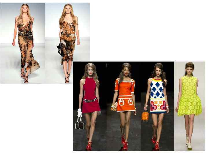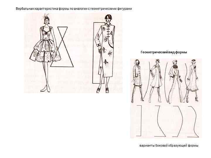 Основные элементы формы одежды Элемент формы Основные разновидности элемента формы Геометрический вид (конфигурация) Прямоугольник, квадрат, «песочные часы» , «капля» , комбинированная геометрическая форма Вид поверхности Гладкая, рельефная, со сборками, складчатая, однородная, неоднородная Величина формы Большая, средняя, малая, комбинированная Конструктивные линии Боковые, плечевые, шаговые срезы, пройма, средний срез спинки Декоративные линии Линии декоративных отделочных деталей, отделочных швов, кантов, планок, обтачек, низа изделия Конструктивно-декоративные линии Линии рельефов, подрезов, кокеток, составных частей рукавов, юбок, брюк Силуэтные линии Боковые, плечевые, линии низа, боковые контуры рукава, линии контуров полочки и спинки в профильной проекции Физико-механические свойства материалов Растяжимость, драпируемость, толщина, жесткость Цвет и рисунок материала Однотонный, с рисунком, в клетку, полоску с различной величиной раппорта