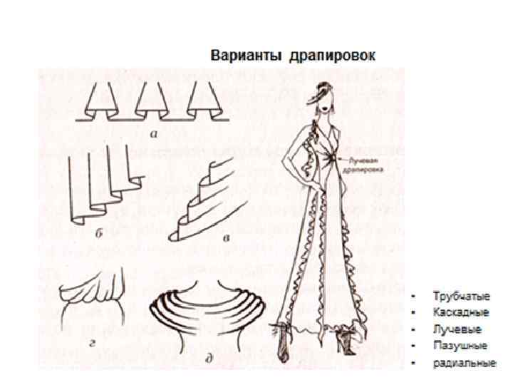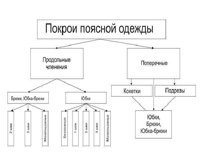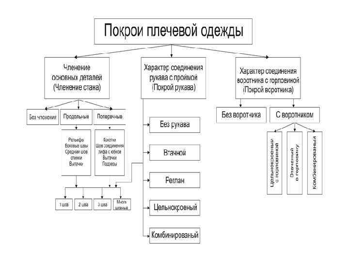 • Объемную форму из плоского материала можно получить различными способами: швами (вертикальными, горизонтальными, наклонными), вытачками, сборками, драпировками, складками, фалдами, деформацией материла с последующей фиксацией. • Типовые варианты членения объемной поверхности образуют покрои одежды. • Покрой является основной характеристикой конструкции. Покрой определяет, на какие детали и как с помощью линий (швов) расчленяется поверхность одежды.