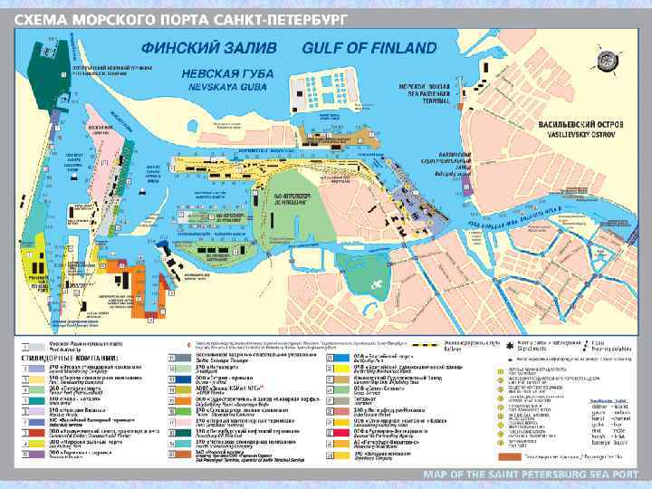 Схема крупного порта: 1 – акватория порта; 2 – территория порта; 3 – волнолом; 4 – мол; 5 – пирс; 6 – набережная: 7 – бассейн; 8 – маяк; 9 – портовые огни; 10 – предпортовая железнодорожная