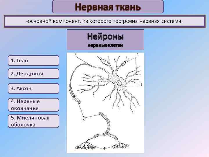 НЕЙРОН Основная структурная и функциональная единица нервной системы - это НЕЙРОН (от греч. neuron - нерв), нервная клетка, состоящая из тела и отходящих от него отростков - относительно коротких дендритов и длинного аксона. Нейроны проводят нервные импульсы от рецепторов в центральную нервную систему (чувствительный нейрон), от центральной нервной системы к исполнительным органам (двигательный нейрон), соединяют между собой несколько других нервных клеток (вставочные нейроны). Взаимодействуют нейроны между собой и с клетками исполнительных органов через синапсы.