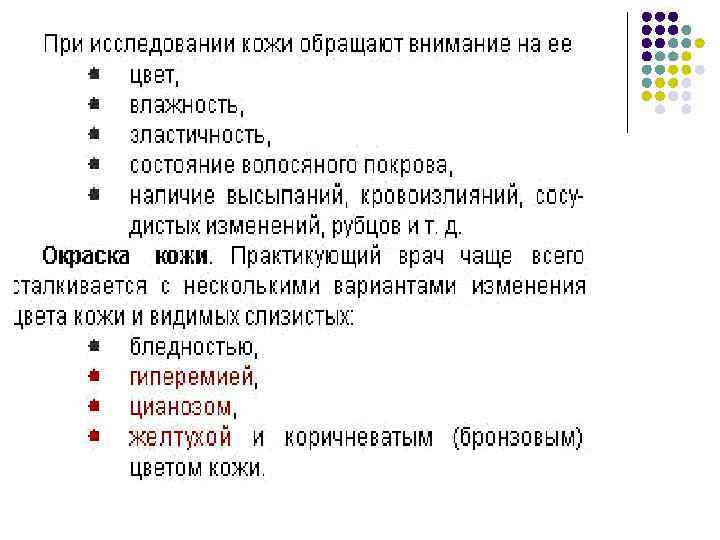Изменения цвета кожных покровов l l l Бледность отмечается при анемиях, спазме поверхностных артерий, при отеках Покраснение кожи (hyperemia) – при повышении содержания эритроцитов и Hb крови, расширении кожных сосудов Синюшность или цианоз (cyanozis) – при накоплении в крови восстановленного Hb при дыхательной (диффузный, теплый) или сердечной недостаточности (периферический или холодный – акроцианоз)